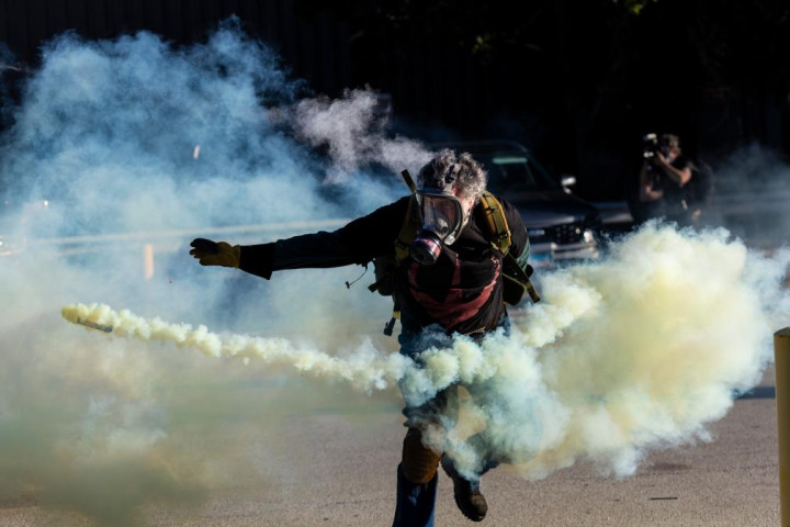 9月26日,在位于美国芝加哥西郊布罗德维尤市的移民与海关执法局办事机构外,抗议者在冲突中将执法人员发射的催泪弹瓶扔回。新华社发(文森特·约翰逊摄)